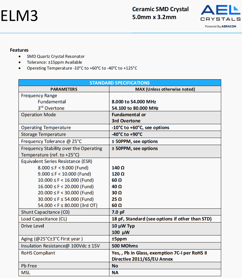 | ELM8-32.000MHz-16-R40-B1U-T | AEL Crystals | ELM8 | 32 MHz | ±10ppm | ±10ppm | 16 pF |