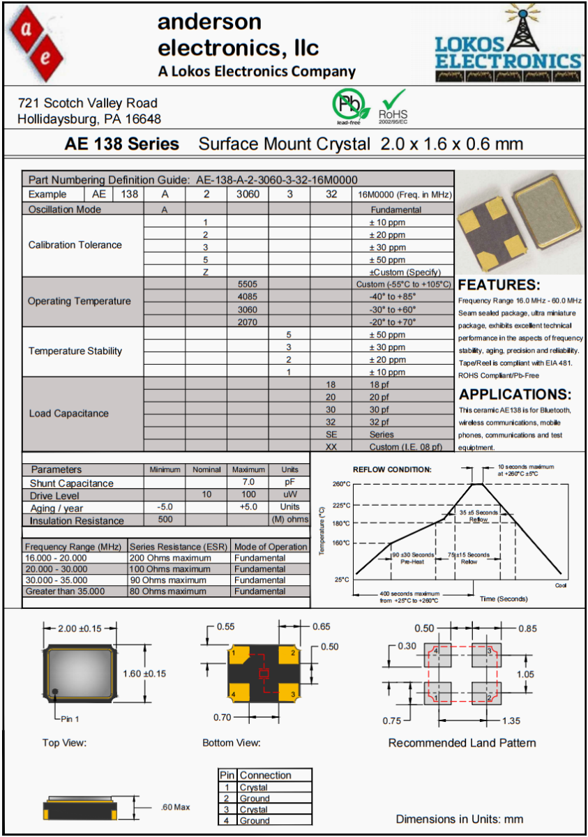 Anderson汽車輔助駕駛晶振,AE138高精度晶振,AE-138-A-2-4085-3-10-40M0000美國晶振,美國Anderson晶振公司,安德森晶振,進(jìn)口晶振,AE-138晶振,無源晶振,石英晶振,貼片晶振,超小型晶振,2016晶振,無源晶振,貼片晶振,無人機晶振,汽車輔助駕駛晶振,歐美進(jìn)口晶振,低損耗晶振,高品質(zhì)晶振。該陶瓷AE138適用于藍(lán)牙,無線通信,移動電話,通信和測試設(shè)備等其他IT產(chǎn)品的晶振應(yīng)用,三態(tài)功能,PC和LCDM等高端數(shù)碼領(lǐng)域,符合RoHS/無鉛。頻率范圍16.0 MHz - 60.0 MHz Seam密封封裝,超小型封裝,在頻率穩(wěn)定性、老化性、精度和可靠性方面具有優(yōu)異的技術(shù)性能。磁帶/卷軸符合EIA 481標(biāo)準(zhǔn)。