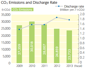 我們更換近800熒光燈和LED燈在中心實驗室在2013財政年度和分銷中心.由于上述努力,2012-2013財年看到減少二氧化碳排放量分別占11.7%和15.4%相比2011年的水平.的放電率指標(biāo)(單位產(chǎn)值二氧化碳排放)、環(huán)保目標(biāo)的設(shè)定,沒有進(jìn)步,因為在生產(chǎn)中減少值大于減少能源消耗.