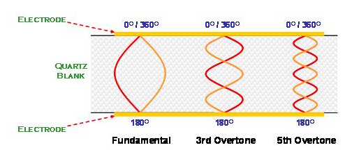 在AT切割角度的石英晶體共振子主要是以厚度剪切振蕩模態(tài)存在. "CM315-32.768KDZY-UT",石英晶體在共振時(shí), 除了基本波振蕩之外, 高階的倍頻共振也與基本波振蕩同時(shí)存在于石英晶體的電極區(qū)域之間. 但是, 由于壓電材料的電極是電氣相位相反的振動(dòng)環(huán)境, 所以, 祇有奇數(shù)倍(odd number)的高頻倍頻可以發(fā)生, 偶數(shù)倍(even number)的倍頻共振在石英晶體共振子是不會(huì)存在的(圖).