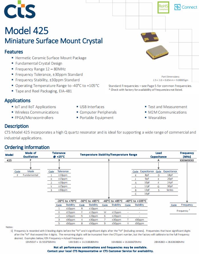 | 425F39E025M0000 | CTS晶振 | 425 | MHz Crystal | 25MHz |