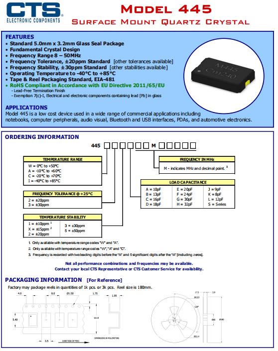 CTS晶振445,445C25D25M00000陶瓷晶振,西迪斯晶振,無源晶振,SMD晶振,無源諧振器,水晶振動(dòng)子,無源貼片晶體,5032mm陶瓷諧振器,型號(hào)445,編碼445C25D25M00000是一款陶瓷面兩腳貼片型的音叉晶體,采用先進(jìn)的生產(chǎn)技術(shù)打磨而成,產(chǎn)品具備良好的穩(wěn)定性能,445型是一種低成本的設(shè)備,廣泛應(yīng)用于商業(yè)應(yīng)用,包括筆記本電腦、電腦外設(shè)、視聽、藍(lán)牙和USB接口、pda和汽車電子產(chǎn)品。