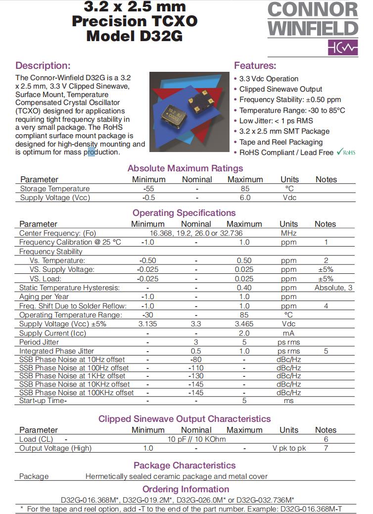 D32G-016.368M|6G模塊晶振|3225mm溫補晶振,ConnorWinfield晶振,D32G有源晶振,D32G-016.368M晶振,3225mm晶振,石英貼片晶振,溫度補償晶體振蕩器,頻率16.368MHz,電壓3.3V,工作溫度-30~85°C,頻率穩(wěn)定性0.5ppm,低抖動晶振,無鉛環(huán)保晶振,6G模塊晶振,北斗導(dǎo)航晶振,通信模塊晶振,儀器設(shè)備應(yīng)用晶振.
