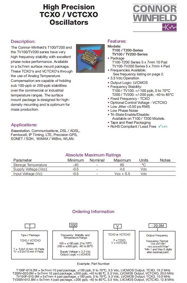 T200V-020.0M|VC-TCXO晶振|6G基站晶振,ConnorWinfield晶振,T200V有源晶振,T200V-020.0M晶振,VC-TCXO晶振,石英晶體振蕩器,7050mm晶振,頻率20MHz,電壓3.3V,工作溫度0~70°C,頻率穩(wěn)定性100ppb,低相噪晶振,高可靠性晶振,6G基站晶振,通信設(shè)備晶振,DSL / ADSL晶振,精密GPS晶振,無(wú)線網(wǎng)絡(luò)晶振,SONET/SDH設(shè)備晶振.