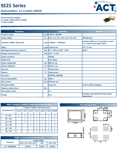 ACT晶振,9225晶振,普通有源晶振.有源晶振,是只晶體本身起振需要外部電壓供應(yīng),起振后可直接驅(qū)動(dòng)CMOS 集成電路,產(chǎn)品本身已實(shí)現(xiàn)與薄型IC(TSSOP封裝,TVSOP封裝)同樣的1mm厚度,斷開時(shí)的消費(fèi)電流是15 µA以下,編帶包裝方式可對應(yīng)自動(dòng)搭載及IR回流焊接(無鉛對應(yīng))產(chǎn)品有幾種電壓供選1.8V,2.5V,3V3.3V,5V,以應(yīng)對不同IC產(chǎn)品需要.