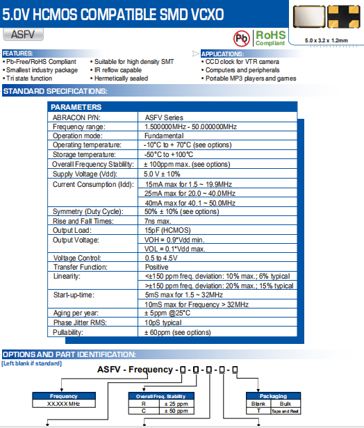 ABRACON晶振,ASFV晶振,VCXO振蕩器.普通貼片石英晶振外觀使用金屬材料封裝的,具有高穩(wěn)定性,高可靠性的石英晶體振蕩器,晶振外觀本身使用金屬封裝,充分的密封性能,可確保其高可靠性,采用編帶包裝,外包裝采用朔膠盤,可在自動貼片機上對應(yīng)自動貼裝等優(yōu)勢.