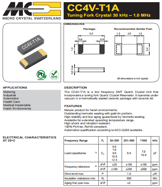 | Microcrystal晶振 | 單位 | CC4V-T1A晶振 | 石英晶振基本條件 |