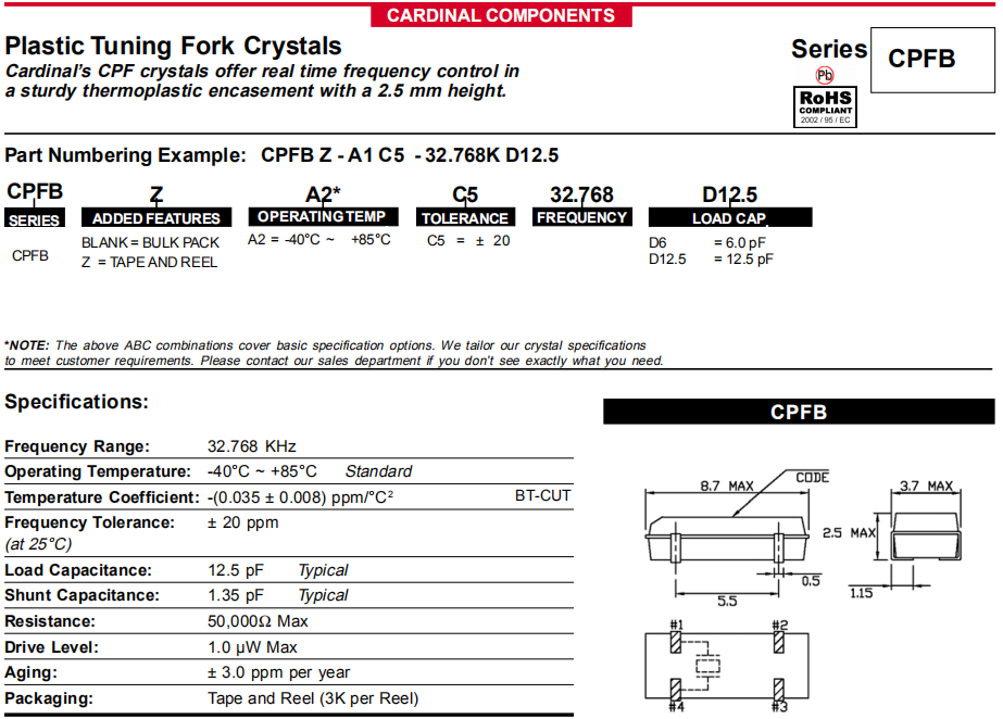 Cardinal晶振,CPFB晶振,石英晶體諧振器.32.768K系列具有超小型,薄型,質(zhì)地輕的表面貼片音叉型石英晶體諧振器,晶振產(chǎn)品本身具備優(yōu)良的耐熱性,耐環(huán)境特性,在辦公自動化,家電領(lǐng)域,移動通信領(lǐng)域可發(fā)揮優(yōu)良的電氣特性,符合無鉛標準,滿足無鉛焊接的回流溫度曲線要求,金屬外殼的石英晶振使得產(chǎn)品在封裝時能發(fā)揮比陶瓷晶振外殼更好的耐沖擊性能.