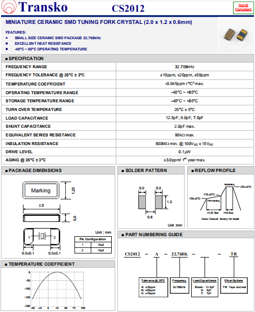 Transko晶振,CS2012晶振,無源環(huán)保晶振.小型貼片石英晶振,外觀尺寸具有薄型表面貼片型石英晶體諧振器,特別適用于有小型化要求的市場領(lǐng)域,比如智能手機,無線藍牙,平板電腦等電子數(shù)碼產(chǎn)品.晶振本身超小型,薄型,重量輕,晶體具有優(yōu)良的耐環(huán)境特性,如耐熱性,耐沖擊性,在辦公自動化,家電相關(guān)電器領(lǐng)域及Bluetooth,Wireless LAN等短距離無線通信領(lǐng)域可發(fā)揮優(yōu)良的電氣特性,滿足無鉛焊接的回流溫度曲線要求.