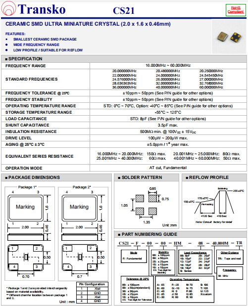 Transko晶振,CS21晶振,高性能石英晶體.貼片石英晶體,體積小,焊接可采用自動貼片系統(tǒng),產(chǎn)品本身小型,表面貼片晶振,特別適用于有小型化要求的電子數(shù)碼產(chǎn)品市場領(lǐng)域,因產(chǎn)品小型,薄型優(yōu)勢,耐環(huán)境特性,包括耐高溫,耐沖擊性等,在移動通信領(lǐng)域得到了廣泛的應(yīng)用,晶振產(chǎn)品本身可發(fā)揮優(yōu)良的電氣特性,滿足無鉛焊接的高溫回流溫度曲線要求.