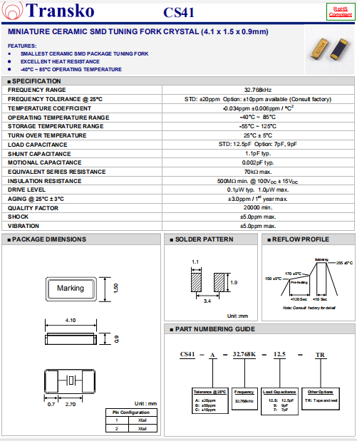 Transko晶振,CS41晶振,音叉晶體.貼片壓電石英晶體,體積小,焊接可采用自動(dòng)貼片系統(tǒng),產(chǎn)品本身小型,表面貼片晶振,特別適用于有小型化要求的電子數(shù)碼產(chǎn)品市場(chǎng)領(lǐng)域,因產(chǎn)品小型,薄型優(yōu)勢(shì),耐環(huán)境特性,包括耐高溫,耐沖擊性等,在移動(dòng)通信領(lǐng)域得到了廣泛的應(yīng)用,晶振產(chǎn)品本身可發(fā)揮優(yōu)良的電氣特性,滿(mǎn)足無(wú)鉛焊接的高溫回流溫度曲線要求.