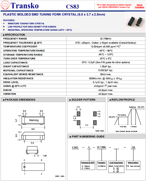 Transko晶振,CS83晶振,進(jìn)口SMD晶體.32.768K時(shí)鐘晶體具有小型,薄型,輕型的貼片晶振表面音叉型晶體諧振器,產(chǎn)品具有優(yōu)良的耐熱性,耐環(huán)境特性,可發(fā)揮晶振優(yōu)良的電氣特性,符合RoHS規(guī)定,滿足無鉛焊接的高溫回流溫度曲線要求,金屬外殼的封裝使得產(chǎn)品在封裝時(shí)能發(fā)揮比陶瓷諧振器外殼更好的耐沖擊性.