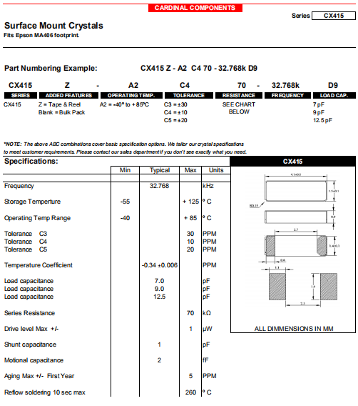 Cardinal晶振,CX415晶振,二腳貼片晶振.貼片表晶32.768K系列具有超小型,薄型,質(zhì)地輕的表面貼片音叉型石英晶體諧振器,晶振產(chǎn)品本身具備優(yōu)良的耐熱性,耐環(huán)境特性,在辦公自動化,家電領(lǐng)域,移動通信領(lǐng)域可發(fā)揮優(yōu)良的電氣特性,符合無鉛標(biāo)準(zhǔn),滿足無鉛焊接的回流溫度曲線要求,金屬外殼的石英晶振使得產(chǎn)品在封裝時能發(fā)揮比陶瓷晶振外殼更好的耐沖擊性能.