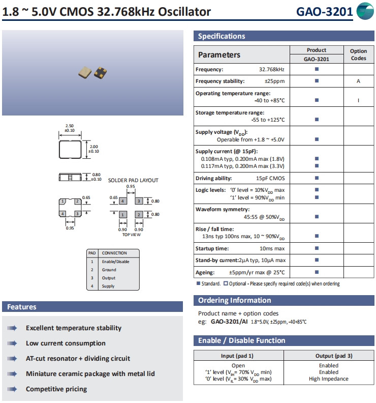 Golledge晶振,GAO-3201晶振,32.768K振蕩器.小型,薄型,質(zhì)地輕的表面貼片音叉型晶體振蕩器,手機(jī)晶體,產(chǎn)品體積小,特別適用于各種小巧的便攜式消費(fèi)電子數(shù)碼產(chǎn)品,在移動(dòng)通信領(lǐng)域廣泛的應(yīng)用,晶振產(chǎn)品本身可發(fā)揮優(yōu)良的電氣特性,滿足無鉛焊盤的高溫回流溫度曲線要求.
