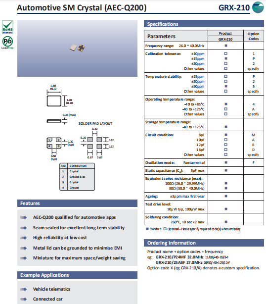 Golledge晶振,GRX-210晶振,高質(zhì)量石英晶體.小型貼片石英晶振,外觀尺寸具有薄型表面貼片型石英晶體諧振器,特別適用于有小型化要求的市場(chǎng)領(lǐng)域,比如智能手機(jī),無(wú)線藍(lán)牙,平板電腦等電子數(shù)碼產(chǎn)品.晶振本身超小型,薄型,重量輕,晶體具有優(yōu)良的耐環(huán)境特性,如耐熱性,耐沖擊性,在辦公自動(dòng)化,家電相關(guān)電器領(lǐng)域及Bluetooth,WirelessLAN等短距離無(wú)線通信領(lǐng)域可發(fā)揮優(yōu)良的電氣特性,滿足無(wú)鉛焊接的回流溫度曲線要求.
