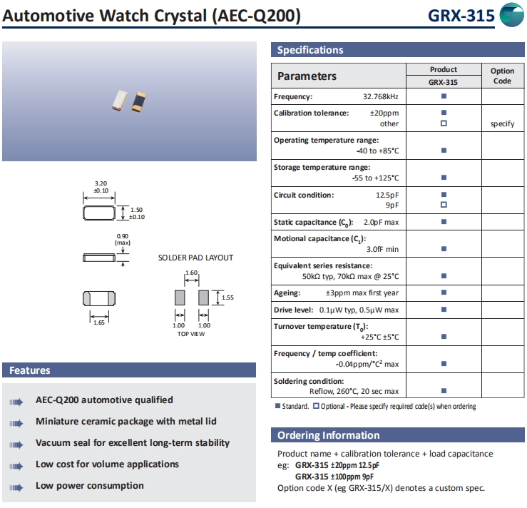 Golledge晶振,GRX-315晶振,音叉石英晶體.普通石英晶振,小體積SMD時鐘晶體諧振器,是貼片音叉晶體,千赫頻率元件,應(yīng)用于時鐘模塊,智能手機(jī),全球定位系統(tǒng),因產(chǎn)品本身體積小,SMD編帶型,可應(yīng)用于高性能自動貼片焊接,被廣泛應(yīng)用到各種小巧的便攜式消費(fèi)電子數(shù)碼時間產(chǎn)品,環(huán)保性能符合ROHS/無鉛標(biāo)準(zhǔn).