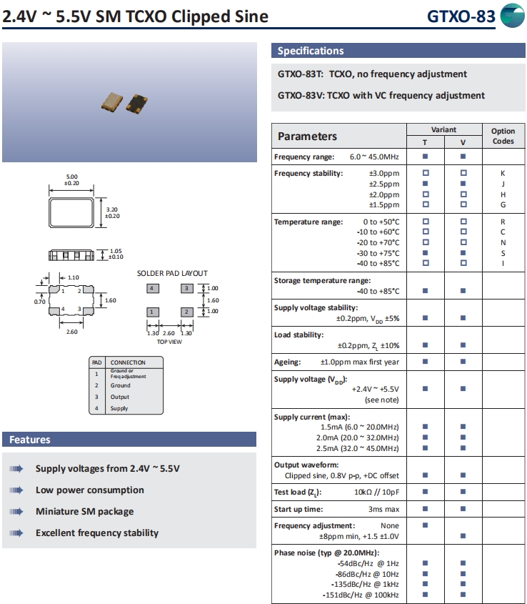 Goliedge晶振,GTXO-83晶振,溫補(bǔ)晶振.5032mm體積的石英晶體振蕩器有源晶振,改產(chǎn)品可驅(qū)動(dòng)2.5V的溫補(bǔ)晶振,壓控晶振,VC-TCXO晶體振蕩器產(chǎn)品,電源電壓的低電耗型,編帶包裝方式,可對(duì)應(yīng)自動(dòng)高速貼片機(jī)自動(dòng)焊接,及IR回流焊接(無鉛對(duì)應(yīng)),為無鉛產(chǎn)品,超小型,質(zhì)地輕.產(chǎn)品被廣泛應(yīng)用到集成電路,程控交換系統(tǒng),無線發(fā)射基站.