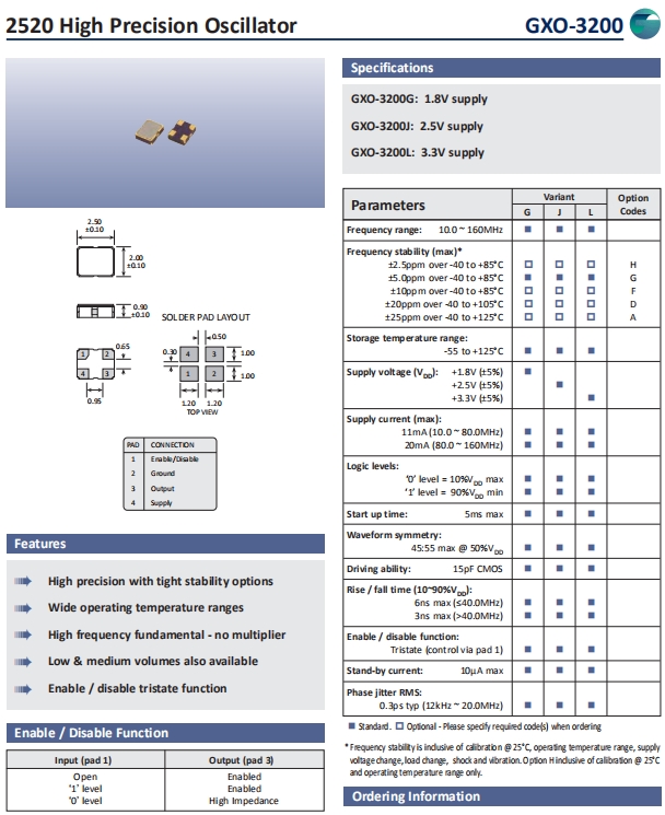 Golledge晶振,GXO-3200晶振,進(jìn)口水晶振蕩子.小型貼片有源晶振,體積的變小也使產(chǎn)品帶來了更高的穩(wěn)定性能,接縫密封石英晶體振蕩器,精度高,覆蓋頻率范圍寬的特點(diǎn),貼片高速自動安裝和高溫回流焊設(shè)計(jì),Optionable待機(jī)輸出三態(tài)輸出功能,電源電壓范圍:1.8V?5V,高穩(wěn)定性,低抖動,低功耗,主要應(yīng)用領(lǐng)域:無線通訊,智能手機(jī),平板筆記本W(wǎng)LAN,藍(lán)牙,數(shù)碼相機(jī),DSL和各式IT產(chǎn)品的晶振應(yīng)用,三態(tài)功能,PC和LCDM等數(shù)碼領(lǐng)域,符合RoHS/無鉛.