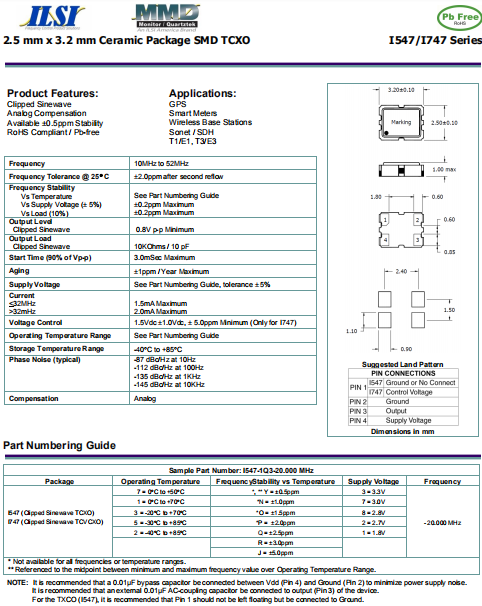 ILSI晶振,I547晶振,溫補(bǔ)振蕩器.有源晶振,是只晶體本身起振需要外部電壓供應(yīng),起振后可直接驅(qū)動(dòng)CMOS 集成電路,產(chǎn)品本身已實(shí)現(xiàn)與薄型IC(TSSOP封裝,TVSOP封裝)同樣的1mm厚度,斷開(kāi)時(shí)的消費(fèi)電流是15 µA以下,編帶包裝方式可對(duì)應(yīng)自動(dòng)搭載及IR回流焊接(無(wú)鉛對(duì)應(yīng))產(chǎn)品有幾種電壓供選1.8V,2.5V,3V3.3V,5V,以應(yīng)對(duì)不同IC產(chǎn)品需要.