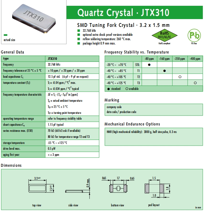 JAUCH晶振,JTX310晶振,壓電石英晶體.貼片表晶32.768K系列具有超小型,薄型,質(zhì)地輕的表面貼片音叉型石英晶體諧振器,晶振產(chǎn)品本身具備優(yōu)良的耐熱性,耐環(huán)境特性,在辦公自動化,家電領(lǐng)域,移動通信領(lǐng)域可發(fā)揮優(yōu)良的電氣特性,符合無鉛標(biāo)準(zhǔn),滿足無鉛焊接的回流溫度曲線要求,金屬外殼的石英晶振使得產(chǎn)品在封裝時能發(fā)揮比陶瓷晶振外殼更好的耐沖擊性能.