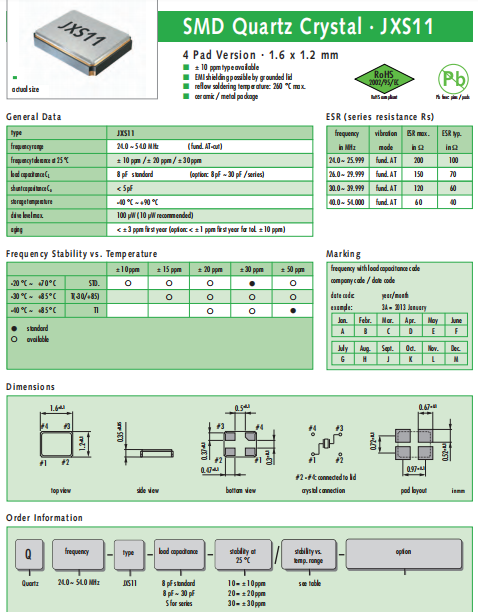 JAUCH晶振,JXS11晶振,耐高溫晶體諧振器.貼片石英晶體,體積小,焊接可采用自動(dòng)貼片系統(tǒng),產(chǎn)品本身小型,表面貼片晶振,特別適用于有小型化要求的電子數(shù)碼產(chǎn)品市場領(lǐng)域,因產(chǎn)品小型,薄型優(yōu)勢,耐環(huán)境特性,包括耐高溫,耐沖擊性等,在移動(dòng)通信領(lǐng)域得到了廣泛的應(yīng)用,晶振產(chǎn)品本身可發(fā)揮優(yōu)良的電氣特性,達(dá)到了無鉛焊接的高溫回流溫度曲線的標(biāo)準(zhǔn).