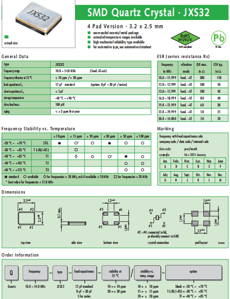 JAUCH晶振,JXS32晶振,高質量石英晶振.貼片石英晶振最適合用于車載電子領域的小型表面貼片石英晶體諧振器.也可對應有高可靠性要求的引擎控制用CPU的時鐘部分簡稱為時鐘晶體振蕩器,在極端嚴酷的環(huán)境條件下也能發(fā)揮穩(wěn)定的起振特性,產品本身具有耐熱,耐振,耐撞擊等優(yōu)良的耐環(huán)境特性,滿足無鉛焊接的回流溫度曲線要求,符合AEC-Q200標準.