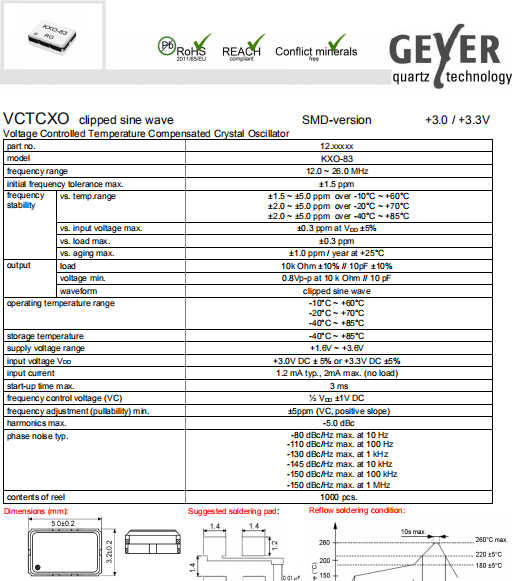Geyer晶振,KXO-83晶振,壓控溫補振蕩器.小型SMD有源晶振,從最初超大體積到現(xiàn)在的7050mm,6035mm,5032mm,3225mm,2520mm體積,有著翻天覆地的改變,體積的變小也使產(chǎn)品帶來了更高的穩(wěn)定性能,接縫密封石英晶體振蕩器,精度高,覆蓋頻率范圍寬的特點,SMD高速自動安裝和高溫回流焊設(shè)計,Optionable待機輸出三態(tài)輸出功能,電源電壓范圍:1.8V?5 V,高穩(wěn)定性,低抖動,低功耗,主要應(yīng)用領(lǐng)域:無線通訊,高端智能手機,平板筆記本W(wǎng)LAN,藍(lán)牙,數(shù)碼相機,DSL和其他IT產(chǎn)品的晶振應(yīng)用,三態(tài)功能,PC和LCDM等高端數(shù)碼領(lǐng)域,符合RoHS/無鉛.