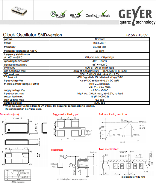 Geyer晶振,KXO-V32T晶振,時鐘晶體振蕩器.有源晶振,是只晶體本身起振需要外部電壓供應(yīng),起振后可直接驅(qū)動CMOS 集成電路,產(chǎn)品本身已實現(xiàn)與薄型IC(TSSOP封裝,TVSOP封裝)同樣的1mm厚度,斷開時的消費電流是15 µA以下,編帶包裝方式可對應(yīng)自動搭載及IR回流焊接(無鉛對應(yīng))產(chǎn)品有幾種電壓供選1.8V,2.5V,3V3.3V,5V,以應(yīng)對不同IC產(chǎn)品需要.