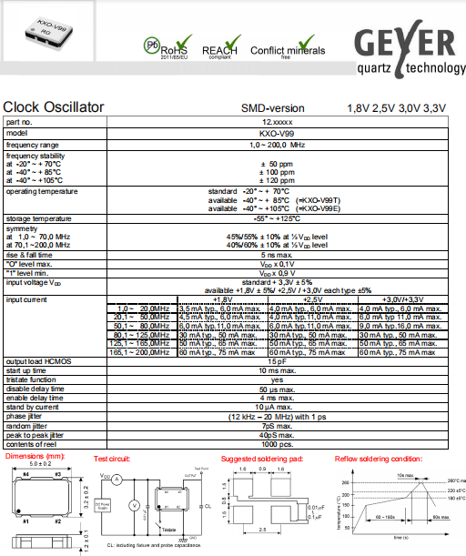 Geyer晶振,KXO-V99晶振,有源晶體振蕩器.小型SMD有源晶振,從最初超大體積到現(xiàn)在的7050mm,6035mm,5032mm,3225mm,2520mm體積,有著翻天覆地的改變,體積的變小也使產(chǎn)品帶來了更高的穩(wěn)定性能,接縫密封石英晶體振蕩器,精度高,覆蓋頻率范圍寬的特點(diǎn),SMD高速自動安裝和高溫回流焊設(shè)計(jì),Optionable待機(jī)輸出三態(tài)輸出功能,電源電壓范圍:1.8V~5 V,高穩(wěn)定性,低抖動,低功耗,主要應(yīng)用領(lǐng)域:無線通訊,高端智能手機(jī),平板筆記本W(wǎng)LAN,藍(lán)牙,數(shù)碼相機(jī),DSL和其他IT產(chǎn)品的晶振應(yīng)用,三態(tài)功能,PC和LCDM等高端數(shù)碼領(lǐng)域,符合RoHS/無鉛.