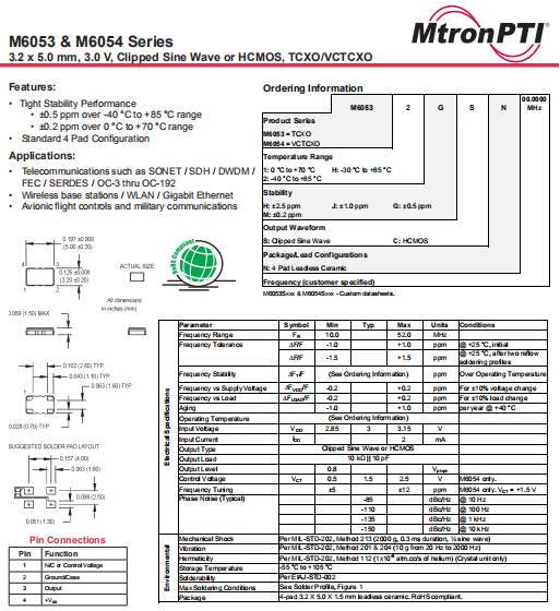 MTRONPTI晶振,M6053晶振,TCXO晶體振蕩器.5032mm體積的石英晶體振蕩器,有源晶振,該產(chǎn)品可驅(qū)動2.5V的溫補晶振,壓控晶振,VC-TCXO晶體振蕩器產(chǎn)品,電源電壓的低電耗型,編帶包裝方式,可對應(yīng)自動高速貼片機自動焊接,及IR回流焊接(無鉛對應(yīng)),為無鉛產(chǎn)品,超小型,質(zhì)地輕.產(chǎn)品被廣泛應(yīng)用到集成電路,程控交換系統(tǒng),無線發(fā)射基站.