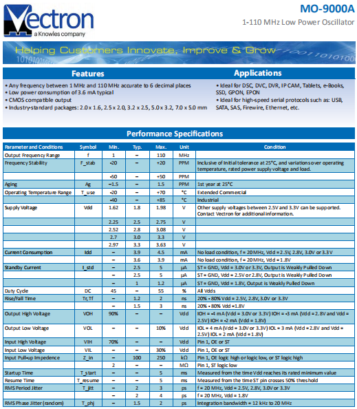 VECTRON晶振,MO-9000A晶振,低電壓振蕩器.小體積貼片2520mm晶振,外觀小型,表面貼片型晶體諧振器,因本身體積小等優(yōu)勢,適用于移動通信終端的基準時鐘等移動通信領域.小型,薄型,輕型 (2.5 × 2.0 × 0.75mm typ.) 具備優(yōu)良的耐環(huán)境特性及高耐熱性強.滿足無鉛焊接的回流溫度曲線要求.