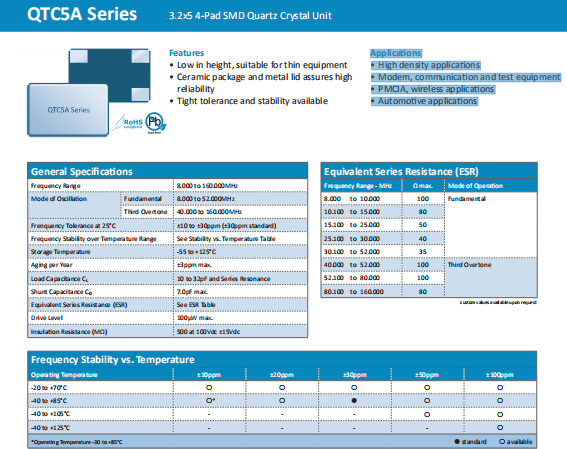 Quarztechnik晶振,QTC5A晶振,高質(zhì)量石英晶體.小體積貼片5032晶振,外觀(guān)小型,表面貼片型石英晶體諧振器,因本身體積小等優(yōu)勢(shì),適用于移動(dòng)通信終端的基準(zhǔn)時(shí)鐘等移動(dòng)通信領(lǐng)域.小型,薄型,輕型(5.0×3.2×0.8mmtyp.)具備優(yōu)良的耐環(huán)境特性及高耐熱性強(qiáng).滿(mǎn)足無(wú)鉛焊接的回流溫度曲線(xiàn)要求.