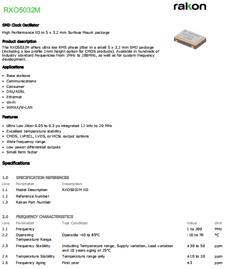 Rakon晶振,RXO5032M晶振,低抖動振蕩器.貼片式石英晶體振蕩器,低電壓啟動功率,并且有多種電壓供選擇,比如有1.8V,2.5V,3.3V,3.8V,5V等,產(chǎn)品被廣泛應(yīng)用于,平板筆記本,GPS系統(tǒng),光纖通道,千兆以太網(wǎng),串行ATA,串行連接SCSI,PCI-Express的SDH / SONET發(fā)射基站等領(lǐng)域.符合RoHS/無鉛.