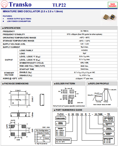 Transko晶振,TLP22晶振,貼片有源晶振.有源晶振,是只晶體本身起振需要外部電壓供應(yīng),起振后可直接驅(qū)動CMOS 集成電路,產(chǎn)品本身已實現(xiàn)與薄型IC(TSSOP封裝,TVSOP封裝)同樣的1mm厚度,斷開時的消費(fèi)電流是15 µA以下,編帶包裝方式可對應(yīng)自動搭載及IR回流焊接(無鉛對應(yīng))產(chǎn)品有幾種電壓供選1.8V,2.5V,3V3.3V,5V,以應(yīng)對不同IC產(chǎn)品需要.