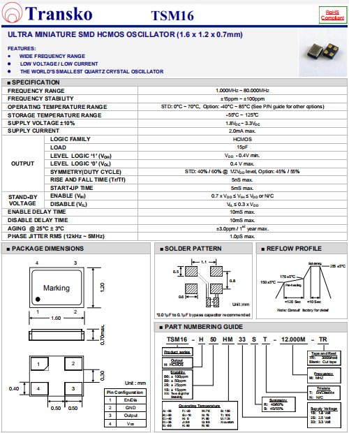 Transko晶振,TSM16晶振,高精度晶振.小體積SMD時鐘晶體振蕩器,是貼片石英晶振,兆赫頻率元件,應用于時鐘模塊,智能手機,全球定位系統(tǒng),因產(chǎn)品本身體積小,SMD編帶型,可應用于高性能自動貼片焊接,被廣泛應用到各種小巧的便攜式消費電子數(shù)碼時間產(chǎn)品,環(huán)保性能符合ROHS/無鉛標準.