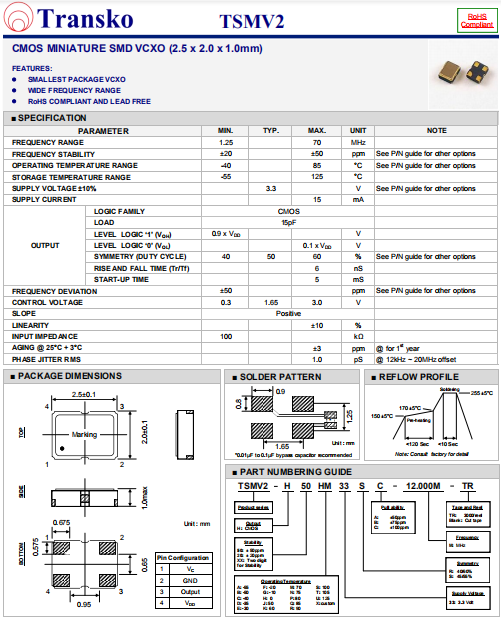 Transko晶振,TSMV2晶振,壓控晶體振蕩器.智能手機晶振,產(chǎn)品具有高精度超小型的表面貼片型石英晶體振蕩器,最適用于移動通信終端的基準時鐘等移動通信領(lǐng)域.比如智能手機,無線通信,衛(wèi)星導航,平臺基站等較高端的數(shù)碼產(chǎn)品,晶振本身小型,薄型具備各類移動通信的基準時鐘源用頻率,貼片晶振具有優(yōu)良的電氣特性,耐環(huán)境性能適用于移動通信領(lǐng)域,滿足無鉛焊接的高溫回流溫度曲線要求.