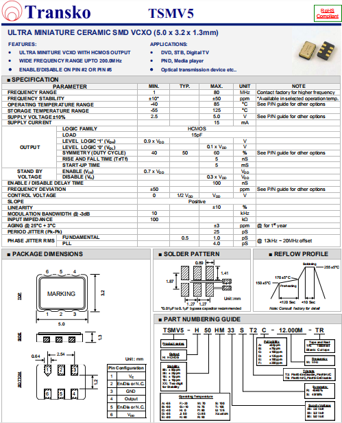 Transko晶振,TSMV5晶振,壓控晶振.小型SMD有源晶振,從最初超大體積到現(xiàn)在的7050mm,6035mm,5032mm,3225mm,2520mm體積,有著翻天覆地的改變,體積的變小也使產(chǎn)品帶來了更高的穩(wěn)定性能,接縫密封石英晶體振蕩器,精度高,覆蓋頻率范圍寬的特點(diǎn),SMD高速自動(dòng)安裝和高溫回流焊設(shè)計(jì),Optionable待機(jī)輸出三態(tài)輸出功能,電源電壓范圍:1.8V~5 V,高穩(wěn)定性,低抖動(dòng),低功耗,主要應(yīng)用領(lǐng)域:無線通訊,高端智能手機(jī),平板筆記本W(wǎng)LAN,藍(lán)牙,數(shù)碼相機(jī),DSL和其他IT產(chǎn)品的晶振應(yīng)用,三態(tài)功能,PC和LCDM等高端數(shù)碼領(lǐng)域,符合RoHS/無鉛.