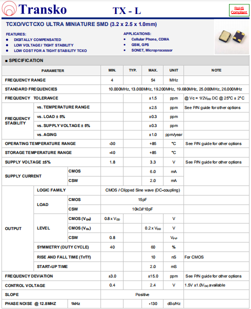 Transko晶振,TX-L晶振,VC-TCXO振蕩器.具有最適合于移動通信設備用途的高穩(wěn)定的頻率溫度特性.為對應低電源電壓的產(chǎn)品.(可對應DC +1.8 V±0.1 V to +3.2 V±0.1 V )高度:最高1.0 mm,體積:0.007 cm3,重量:0.024g,超小型,輕型.低消耗電流,表面貼片型產(chǎn)品.(可對應回流焊) 無鉛產(chǎn)品.滿足無鉛焊接的回流溫度曲線要求.
