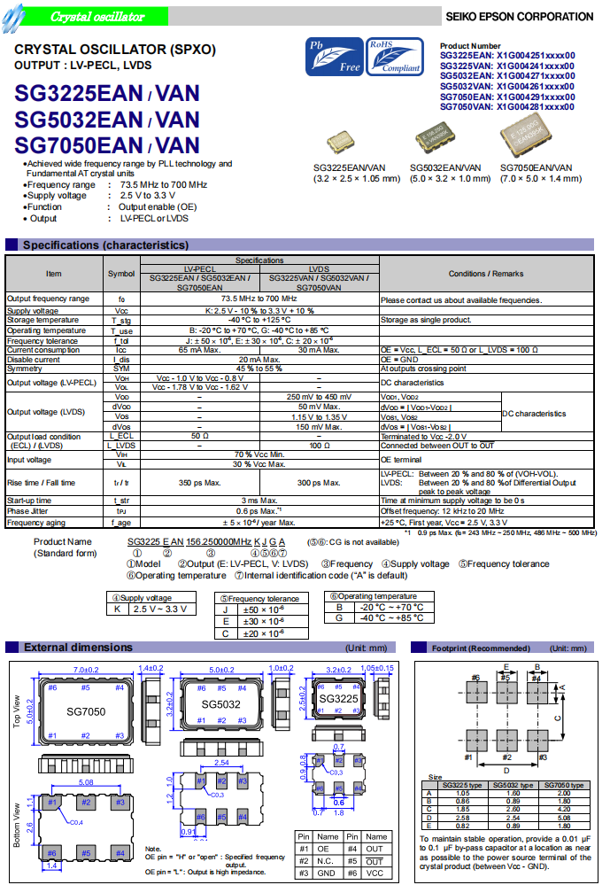 | X1G0042710071 | SG5032EAN | 156.250000 MHz | 5.00 x 3.20 x 1.20 mm | LV-PECL | 2.250 to 3.630 V | -20 to 70 °C |