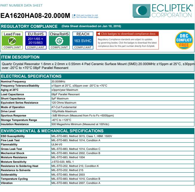 ECLIPTEK晶振,EA1620石英晶振,EA1620HA08-20.000M晶振,貼片晶振本身體積小,超薄型石英晶體振蕩器,特別適用于有目前高速發(fā)展的高端電子數(shù)碼產(chǎn)品,因為晶振本身小型化需求的市場領(lǐng)域,小型,薄型是對應(yīng)陶瓷振蕩器(偏差大)和普通的石英晶體振蕩器(偏差小)的中間領(lǐng)域的一種性價比較出色的產(chǎn)品.產(chǎn)品廣泛用于筆記本電腦,無線電話,衛(wèi)星導(dǎo)航SSD,USB,Blu-ray等用途,符合無鉛焊接的高溫回流焊曲線特性.