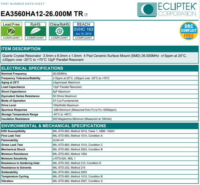 日蝕美國晶振,EA3560HA12-26.000M-TR無線通信晶振,6035mm無源晶體,我們的網(wǎng)站是為了幫助客戶確定黃華產(chǎn)品的RoHS和pb免費狀態(tài)。我們的RoHS/pbfree認(rèn)證和IPC-1752材料聲明工具為我們的客戶提供了按零件編號處理他們的文檔請求的能力,并在幾秒鐘內(nèi)收到一個全面的自動回復(fù)。