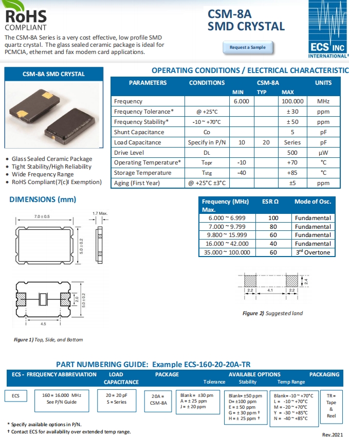 ECS-200-20-20A-TR\CSM-8A\20兆赫茲\7050mm\SMD晶體,尺寸7050mm,頻率為20MHZ,ECS晶振,美國伊西斯晶振,石英貼片晶振,進(jìn)口無源諧振器,SMD晶體,石英晶體,石英晶體諧振器,音叉晶體,高質(zhì)量晶振,低損耗晶振,7050mm貼片晶振,無線設(shè)備晶振,智能家居晶振,CSM-8A系列是一款非常具有成本效益的低規(guī)格貼片石英晶體。