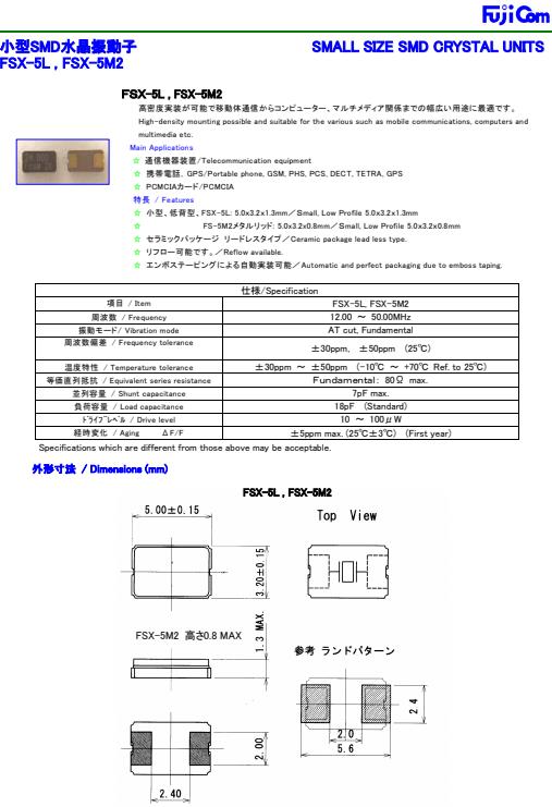 進(jìn)口富士晶振,FSX-5L晶振,FSX-5M2石英晶振,GSM專用晶振,小型表面貼片晶振型,是標(biāo)準(zhǔn)的石英晶體振蕩器,適用于寬溫范圍的電子數(shù)碼產(chǎn)品,家電電器及MP3,MP4,播放器,單片機(jī)等領(lǐng)域.可對應(yīng)8.000MHz以上的頻率,在電子數(shù)碼產(chǎn)品,以及家電相關(guān)電器領(lǐng)域里面發(fā)揮優(yōu)良的電氣特性,滿足無鉛焊接的回流溫度曲線要求.