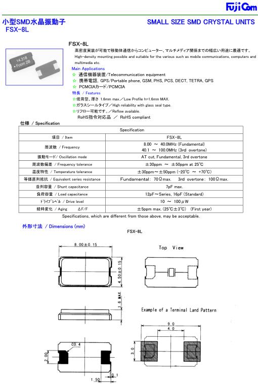 Fujicom富士晶振,FSX-8L兩腳貼片晶振,8045mm無源晶振,貼片石英晶振最適合用于車載電子領(lǐng)域的小型表面貼片石英晶體振蕩器.也可對應(yīng)有高可靠性要求的引擎控制用CPU的時鐘部分簡稱為時鐘晶體振蕩器,在極端嚴(yán)酷的環(huán)境條件下也能發(fā)揮穩(wěn)定的起振特性,產(chǎn)品本身具有耐熱,耐振,耐撞擊等優(yōu)良的耐環(huán)境特性,滿足無鉛焊接的回流溫度曲線要求,符合AEC-Q200標(biāo)準(zhǔn).