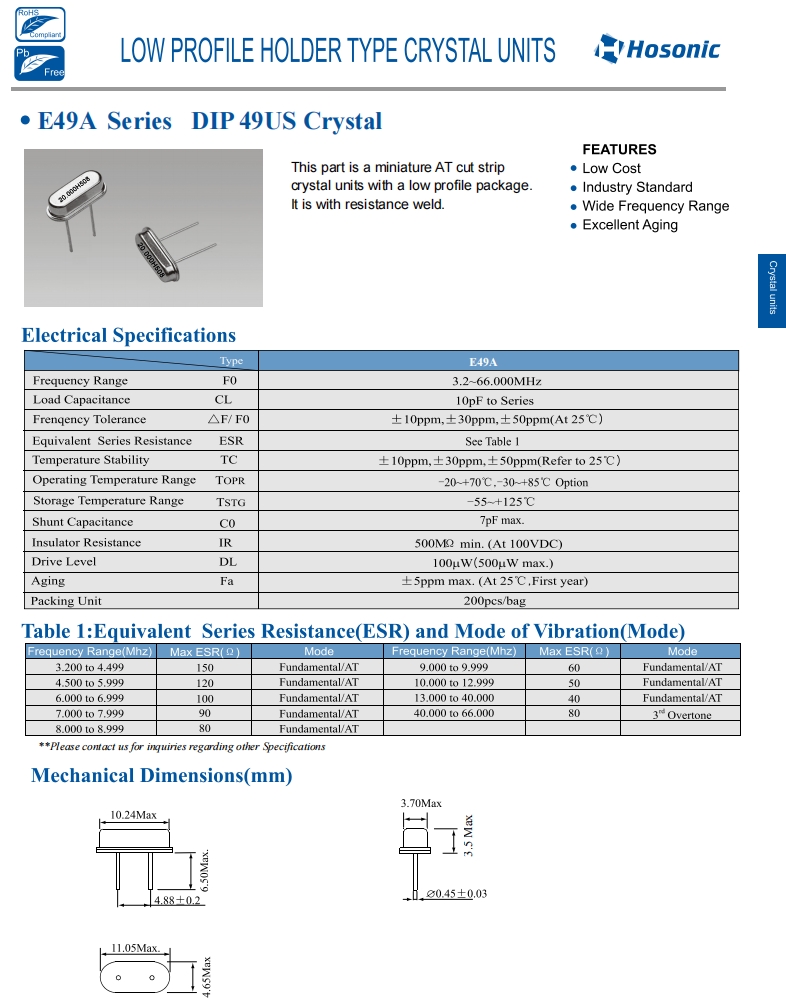 | E49A49E00000ME | Hosonic晶振 | E49A | 49 MHz | 20 pF | ±30 ppm | ±30 ppm |