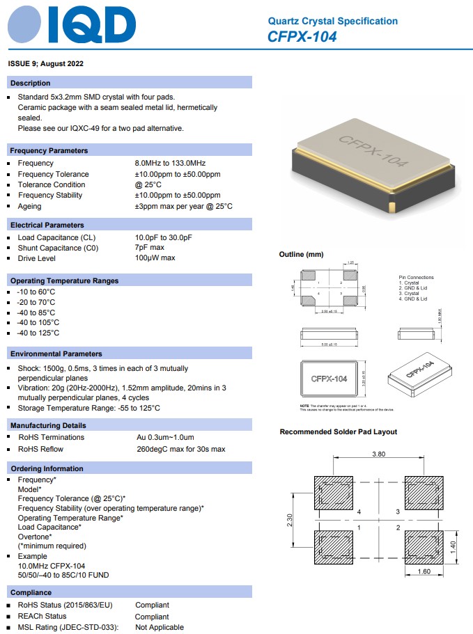 LFXTAL059539REEL,5032mm,CFPX-104,IQD石英晶體諧振器,車載晶振,參數(shù)表