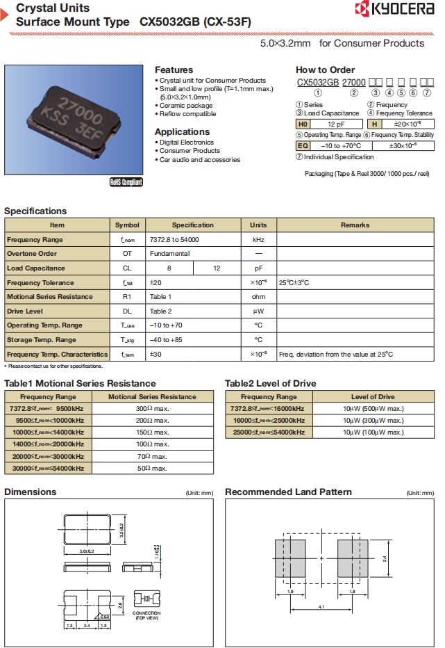| CX5032GB27000H0PESZZ | AVX Corp/Kyocera Corp | CX5032GB, Kyocera | MHz Crystal | 27MHz | -10°C ~ 70°C |