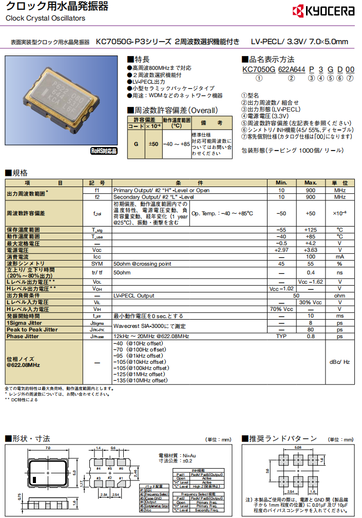 KC7050G622.080P3GD00|LV-PECL差分石英晶振|6G模塊晶振 參數(shù)表