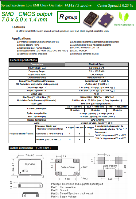MERCURY晶振,臺產有源晶振,HM572R時鐘晶體振蕩器.貼片式石英晶體振蕩器,低電壓啟動功率,并且有多種電壓供選擇,比如有1.8V,2.5V,3.3V,3.8V,5V等,產品被廣泛應用于,平板筆記本,GPS系統(tǒng),光纖通道,千兆以太網(wǎng),串行ATA,串行連接SCSI,PCI-Express的SDH / SONET發(fā)射基站等領域.符合RoHS/無鉛.