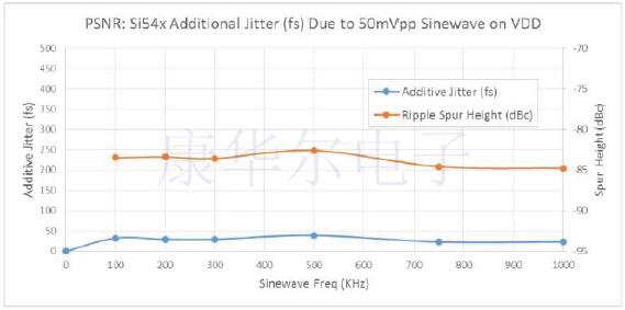 下圖顯示了Ultra系列抖動性能與工作頻率和溫度的關(guān)系.有兩種性能等級.Si545/6/7器件可提供典型值為80fsRMS(12kHz至20MHz)的相位抖動性能,而Si540/1/2晶振可提供典型值為125fs RMS(12kHz至20MHz)的抖動性能.鑒于其抖動性能,Si54x使抖動容限最大化,并使客戶放心設(shè)計. 集成電源噪聲調(diào)節(jié):
